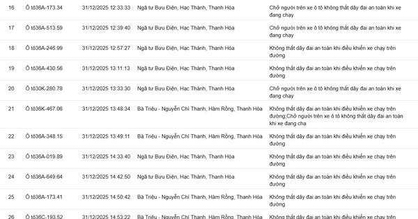 Công an tỉnh Thanh Hóa thông báo, từ ngày 31/12/2025 đến ngày 02/1/2026, thông qua thiết bị kỹ thuật nghiệp vụ, các tổ công tác của phòng CSGT đã phát hiện, ghi nhận bằng hình ảnh tổng cộng 265 trường hợp phương tiện không chấp hành đúng các quy định về TTATGT đường bộ. Danh sách biển số vi phạm cụ thể như sau: