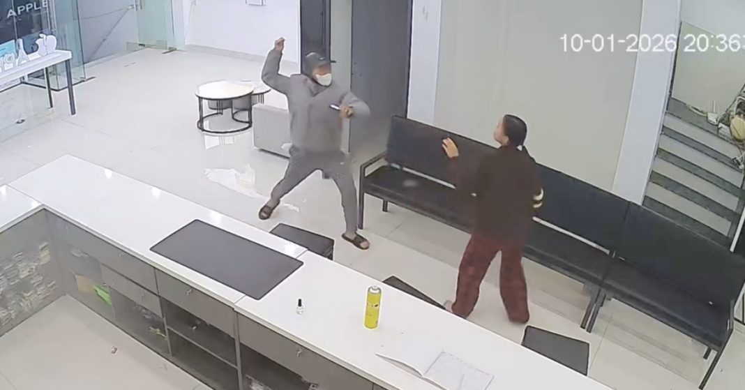 Kẻ cướp dùng vật nhọn đe dọa nữ chủ cửa hàng khi cướp hai chiếc Iphone 14 Promax – Ảnh: TÂM PHẠM