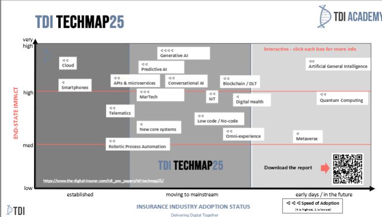 Theo báo cáo TDI Techmap 25 của tổ chức uy tín The Digital Insurer, GenAI và Predictive AI được các doanh nghiệp bảo hiểm ứng dụng với tốc độ “chóng mặt”. Nếu năm 2023, nhiều doanh nghiệp bảo hiểm chỉ mới có ý định, hoặc ứng dụng AI ở bước cơ bản, thì đến 2025, ứng dụng AI trong ngành đã lên mức thịnh hành và phổ biến.