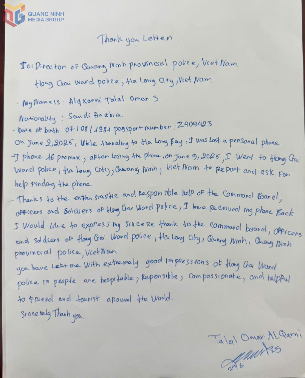 Ngày 24/6/2025, anh ALQUARNI TALAL OMARS quay lại thành phố Hạ Long để nhận lại tài sản. Đại diện Công an phường Hồng Gai phối hợp cùng các doanh nghiệp dịch vụ biển tổ chức bàn giao chiếc điện thoại cho anh. Xúc động và biết ơn trước tinh thần trách nhiệm, lòng nhiệt tình của lực lượng Công an, anh ALQUARNI đã viết thư cảm ơn, bày tỏ ấn tượng tốt đẹp về hình ảnh Công an tỉnh Quảng Ninh nói chung và Công an phường Hồng Gai nói riêng.
