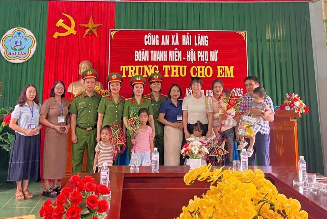 Nhằm mang đến cho các em thiếu nhi một mùa Trung thu ấm áp, đầy ý nghĩa, ngày 03/10/2025, Chi đoàn và Chi hội phụ nữ Công an xã Hải Lăng đã kết nối với Công ty TNHH MTV vận tải Mỹ Hương tổ chức trao 50 suất quà trung thu tại Trường MN Hải Lâm, MN Hải Phú, MN Hải Thượng.