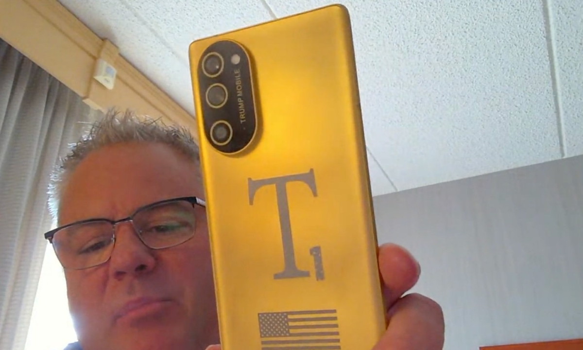 Mẫu Điện thoại Trump T1 xuất hiện thực tế trong một cuộc phỏng vấn với thiết kế mặt lưng mạ vàng, in hình cờ Mỹ và cấu hình tầm trung.