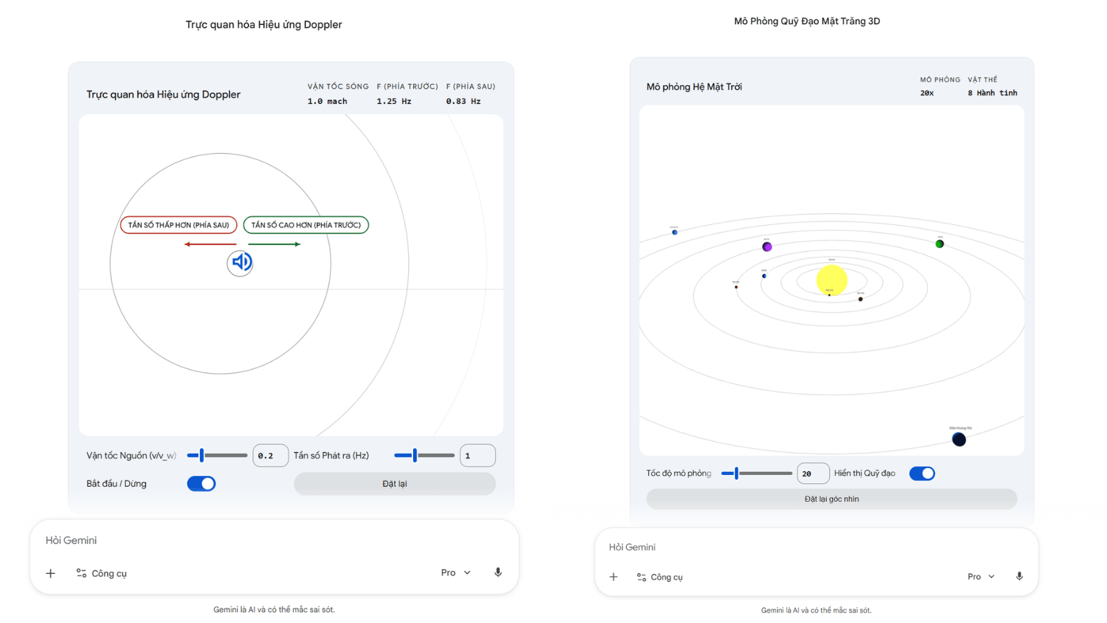 Tính năng này cho phép người dùng thực hiện các thao tác như xoay mô hình 3D, điều chỉnh các thanh trượt biến số hoặc nhập dữ liệu mới để thay đổi kết quả mô phỏng theo thời gian thực. Ví dụ, khi yêu cầu Gemini mô phỏng Hệ Mặt Trời, hệ thống sẽ hiển thị một mô hình không gian ba chiều. Tại đây, người xem có thể thay đổi tốc độ quay, bật hoặc tắt hiển thị đường quỹ đạo, thậm chí là phóng to để quan sát chi tiết bề mặt các thiên thể. Khả năng tương tác này giúp việc tiếp nhận thông tin trở nên trực quan và sinh động hơn hẳn so với cách đọc tài liệu truyền thống.
