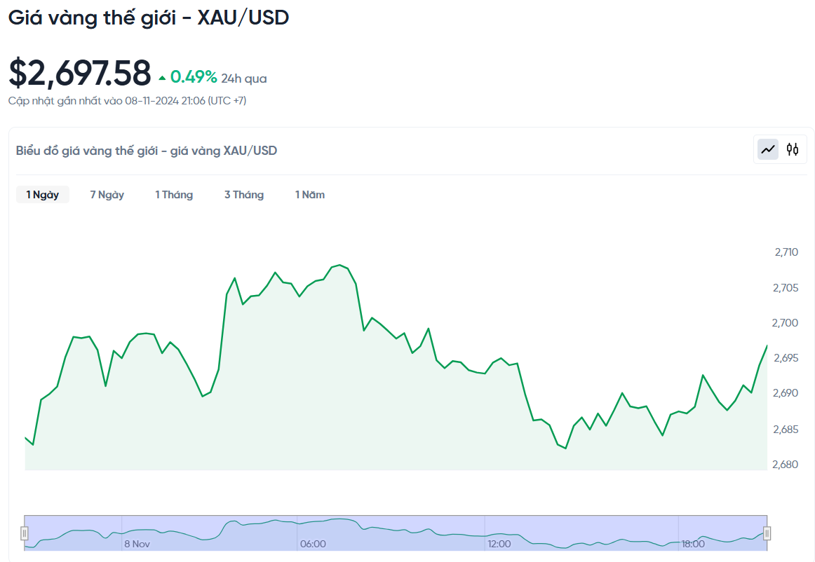 Lý do giá vàng trong nước tăng hôm nay chủ yếu đến từ sự phục hồi của giá vàng thế giới. Trong phiên giao dịch cuối ngày 8/11 tại Mỹ, giá vàng thế giới đã tăng hơn 1%, đạt gần 2.700 USD/ounce, sau khi rơi xuống mức thấp nhất trong 3 tuần vào ngày 7/11.