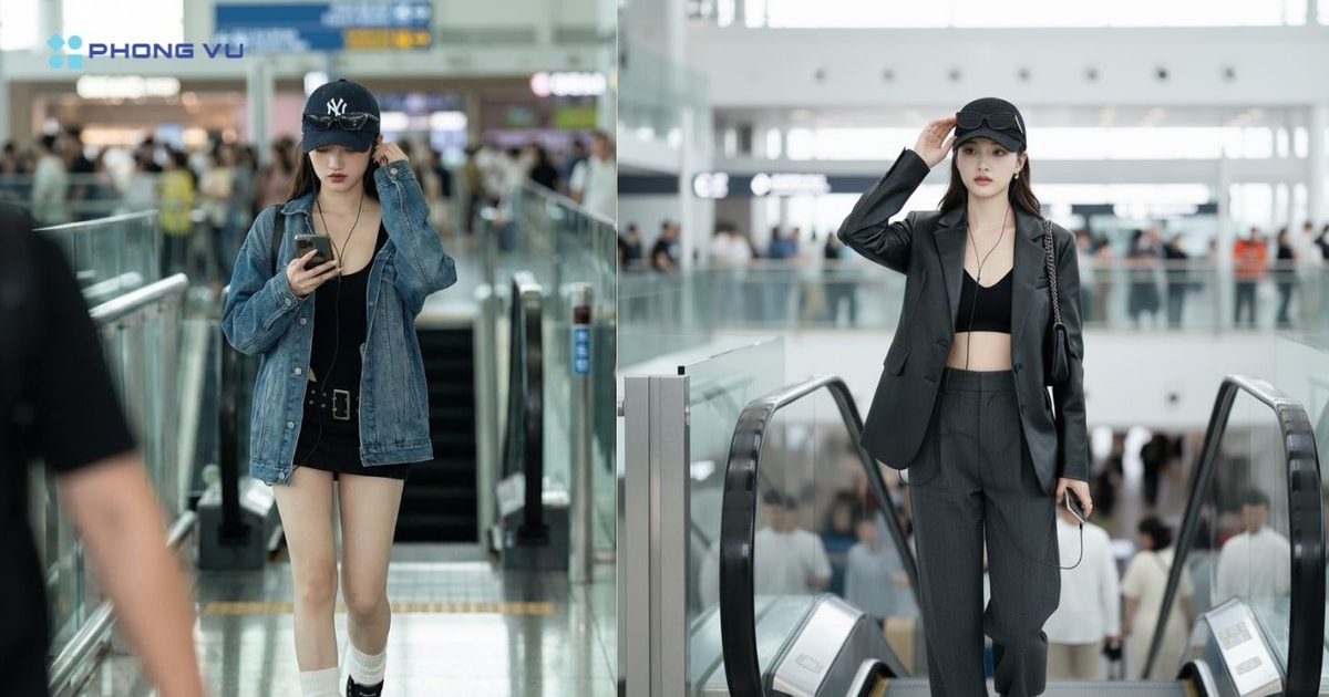 Mẫu prompt này tập trung vào sự tối giản nhưng toát lên khí chất thượng lưu. Trang phục gồm áo trench coat màu be, kính râm bản to, bối cảnh nhà ga sân bay hiện đại với góc chụp paparazzi từ trên xuống.