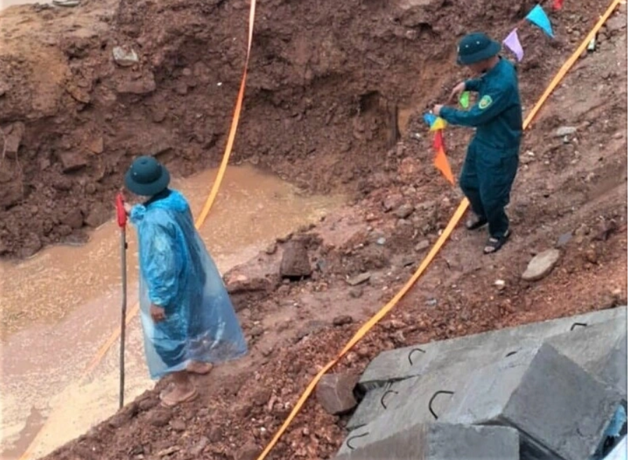 Thông tin ban đầu, chiều 7/10, khi đơn vị thi công đang tiến hành đào mép bờ sông Ngàn Mọ đoạn gần cầu Chợ Vực (thôn Phương Trứ, xã Cẩm Duệ) thì bất ngờ phát hiện một quả bom, trọng lượng khoảng 500kg.