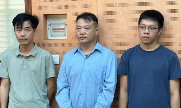 Shark Bình (giữa) và các đồng phạm tại cơ quan điều tra – Ảnh: Công an Hà Nội cung cấp