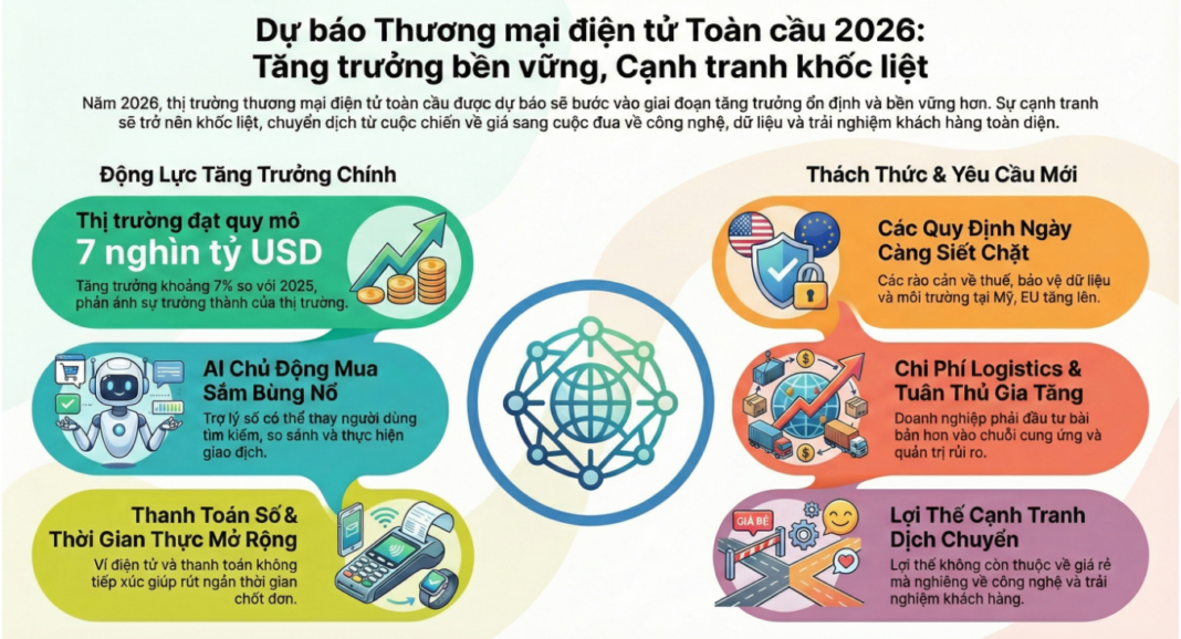Bước sang năm 2026, thương mại điện tử toàn cầu và Việt Nam được dự báo tiếp tục tăng trưởng nhưng theo một quỹ đạo mới, có nhiều điểm rất mới , sẽ có tính bền vững hơn, chọn lọc hơn và cạnh tranh quyết liệt hơn.