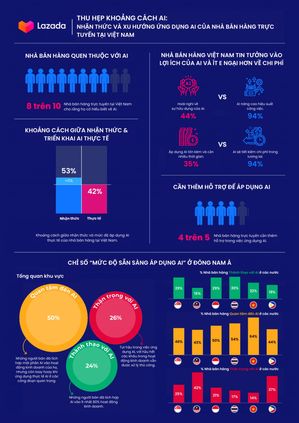 Để hỗ trợ người bán trong hành trình ứng dụng AI, Lazada ra mắt Cẩm nang sẵn sàng áp dụng Trí tuệ nhân tạo cho nhà bán hàng trực tuyến, cung cấp các hướng dẫn mang tính chiến lược dựa trên mức độ thành thạo đối với AI của mỗi người bán hàng. Nghiên cứu cho thấy rằng người bán đã và đang tận dụng các giải pháp AI trên nền tảng Lazada để nâng cao hiệu quả hoạt động, qua đó cho thấy các khoản đầu tư liên tục của Lazada vào các công cụ AI tiên tiến thực sự giúp tinh giản các hoạt động vận hành khi bán hàng trên thương mại điện tử và thúc đẩy khả năng cạnh tranh.