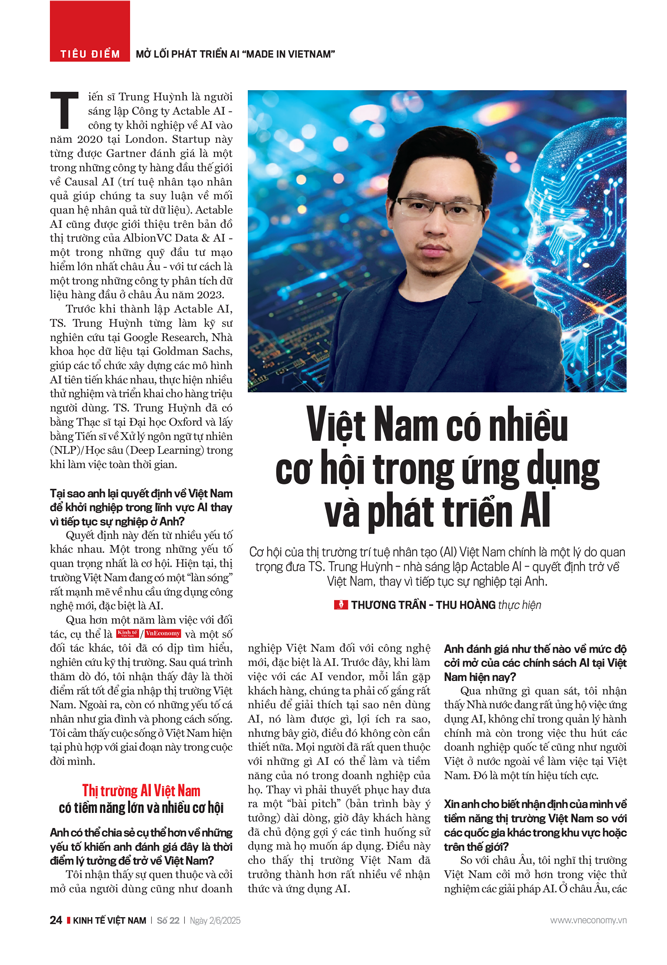 Tuy nhiên, ứng dụng AI vào các use case cụ thể, giải các bài toán đặc thù lại mang lại giá trị lớn và ít cạnh tranh hơn so với phát triển mô hình nền tảng. Vì vậy, tôi nghĩ các doanh nghiệp Việt Nam nên tập trung vào những use case phục vụ khách hàng trong nước trước, rồi sau đó mở rộng ra thị trường quốc tế.